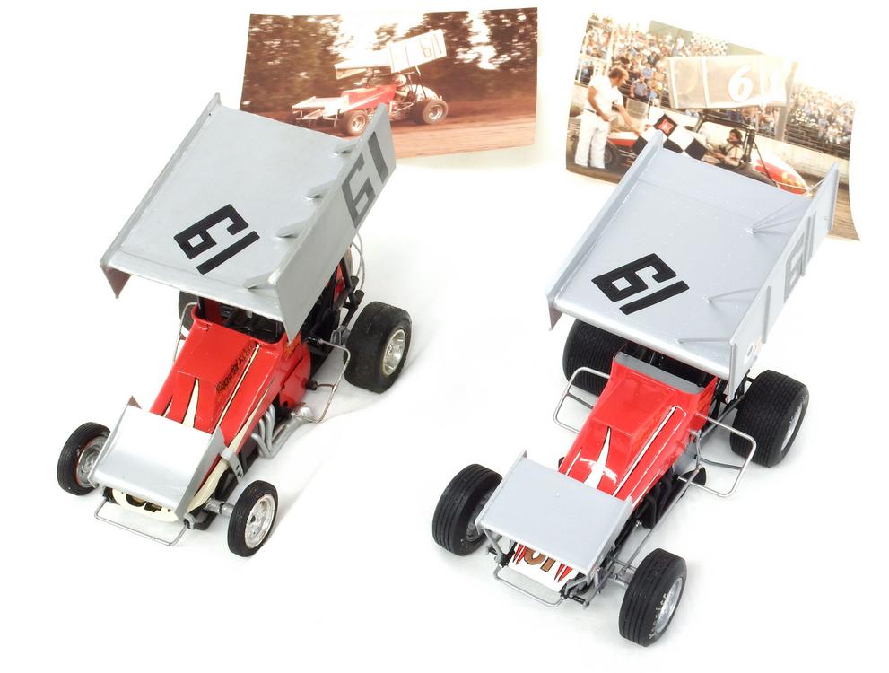 Yes, you are seeing double! The 1/24 car on the left JR was constructed in 1984 and this is the first time we have seen it. The sprint car was raced in 1983 by George McCord. The car on the right he just finished. I have lost track of what features each car had so I will just copy what JR wrote and you can figure it out!: Started W/Monogram sprint car. Built mostly stock, he changed a couple of bars on the frame, built new hood, foot guard panels, nerf bars, R.S. Top wing side and both sides of nose wing. Hand painted numbers and sponsors. The frame was painted with Krylon gloss black, the body with Testors white and red, and the wing with Testors metallic silver. Decals were from the spares box. I feel like I’ve got two cars on one writeup. You figure it out! 😉 In an regards, they are fantastic!