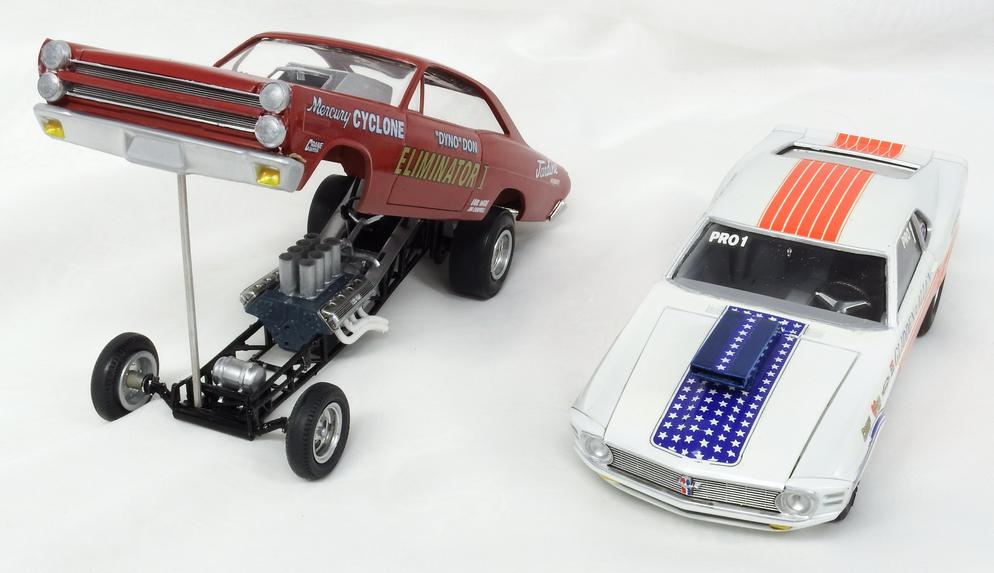 Mark Jahsan showed off his 1/24-1/25 cars! On the left is his AMT Mercury Cyclone which had the first tubular frame and a one-piece fiberglass body funny car. Kit was for an altered wheelbase car, had to move the rear wheels back. Found the frame on eBay and used the kit decals. The other car started life as a a 1/24 Monogram 1970 Mustang Street Boss 302 converted to Pro Stock. Driven by Bob Blidden, winningest (spell check says that’s not a word, Mark!) 😉NARA driver when he retired in 1997. Decals by Fred Cady and the 3D wheels by Meca Machine. Amazing!