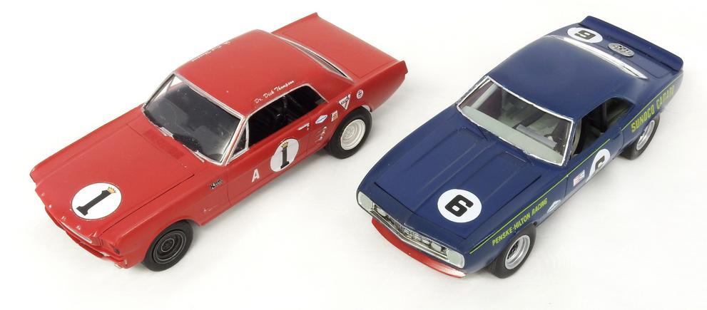 First up we have his red 1/25th AMT 1966 Mustang Coupe. This was the FIRST Trans Am car and helped Ford win first TA Championship. This car didn’t win the first race but it had the fastest lap! The blue car is his 1/25 AMT Camaro, 1968 champioon owned by Roger Penske and drived by legendary Mark Donohue. Mark scratchbuilt the interior, pipes and wiring in the engine compartment. He used Fred Cady decals. Mark even got to meet Penske! Cool!