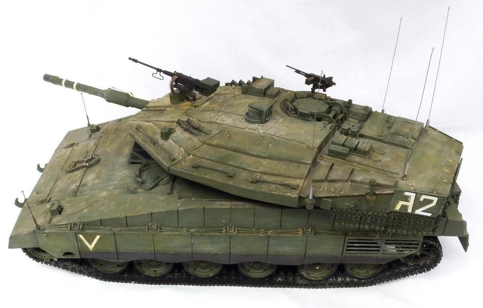 We ended the meeting with Mark Welch so let’s start off with his mammoth 1/16th Heng Long Merkava IV IAC 7.0. He said he purchased it at a good price of $225. It comes with a complete electronics suite including full mobility, turret turns 360, realistic smoke, headlights, taillights, operating gun including barrel and hull recoil. I probably missed something! Has metal suspension and gearbox, painted with Tamiya rattle can paint. Markings for company cdf, A company 2dBn 74h armored brigade. The engine is upfront for crew protection and it can carry six troops in the rear. Took Mark about six months to build and it is awesome!
